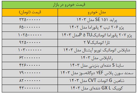 در این میان، قیمت پژو 206 تیپ 3 پانوراما مدل 1402 در بازار با افزایش 10 میلیون تومانی، 650 میلیون تومان قیمت خورده است. پژو 207 دندهای مدل 1403 هم 5 میلیون تومان گران شد و 745 میلیون تومان به فروش رفت. اما پژو 207 پانوراما اتوماتیک TU5P مدل 1403 یک میلیارد و 25 میلیون تومان به فروش رفت. پژو 207 تیپ 5 مدل 1402 نیز 660 میلیون تومان قیمت پیدا کرد. اما پژوپارس ELX-TU5 مدل 1402 با افزایش 3 میلیون تومانی به قیمت 798 میلیون تومان رسید. پژوپارس LX مدل 1402 اما 3 میلیون تومان گران شد و 853 میلیون تومان قیمت پیدا کرد.