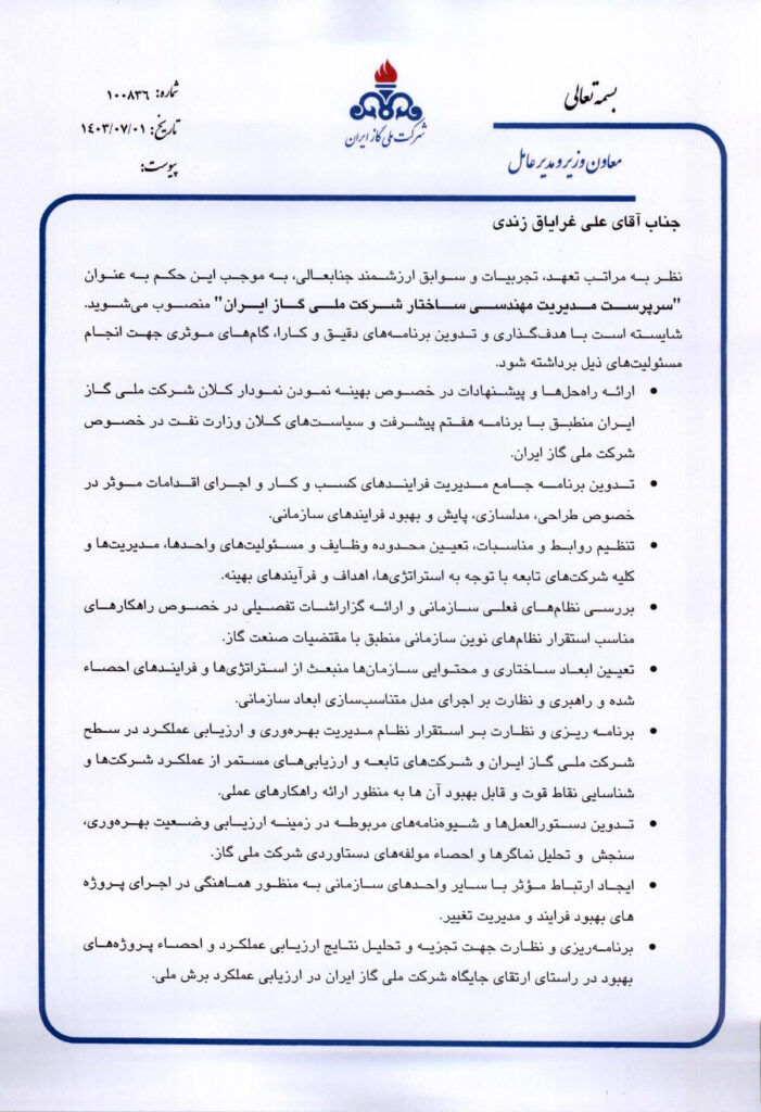 مدیرعامل شرکت ملی گاز ایران در حکمی «علی غرایاق زندی» را بهعنوان سرپرست مدیریت مهندسی ساختار این شرکت منصوب کرد.