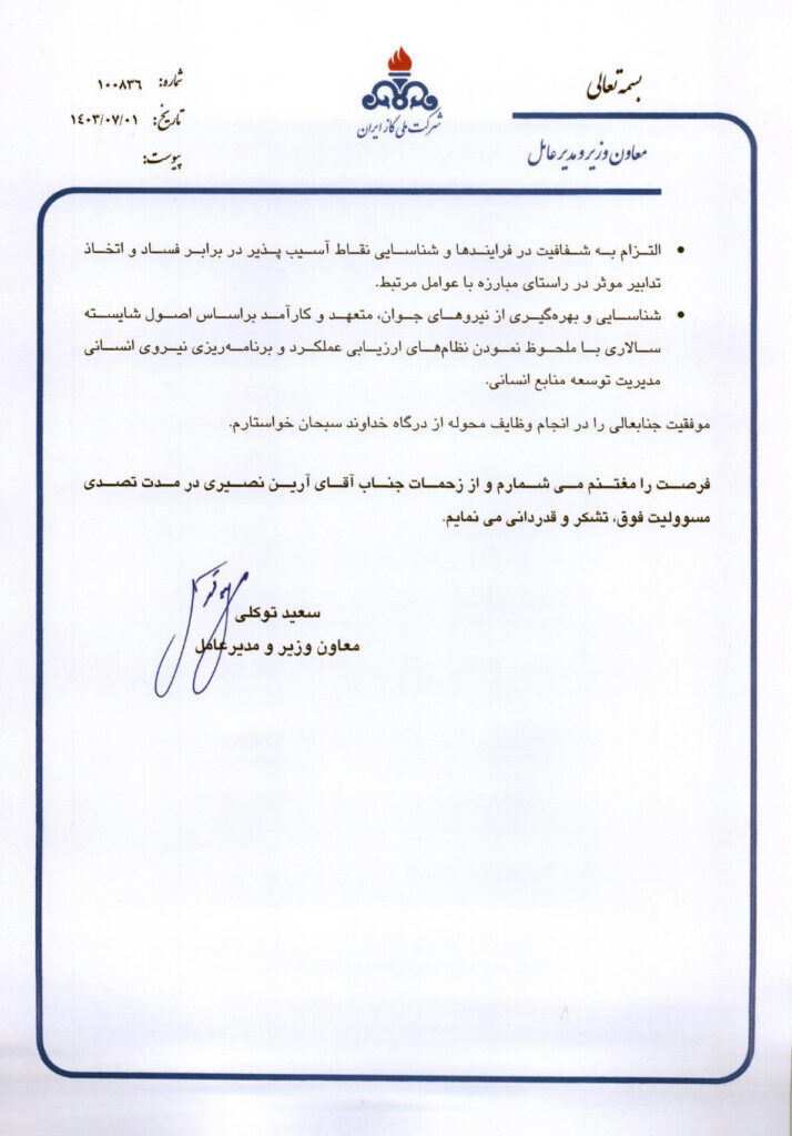 وی همچنین از زحمات آرین نصیری، مدیر پیشین مهندسی ساختار شرکت ملی گاز ایران، قدردانی کرد.