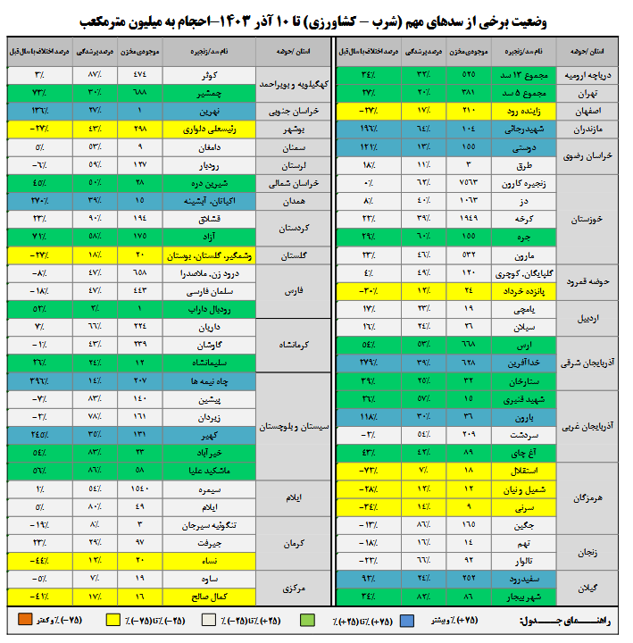 وضعیت برخی از سدهای مهم کشور بیانگر این است که در 22 سد درصد پرشدگی کمتر از 20 درصد است، بهطوری که سد زنجیره کارون و جره، سد جگین استان هرمزگان 85، سد سردشت آذربایجان غربی، سد بیجار استان گیلان، سد ایلام سد داریان 5استان کرمانشاه بیش از 50 درصد آب دارند.