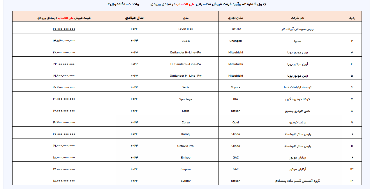 در این دور از عرضه خودروهای وارداتی، 16 مدل خودرو که شامل دو خودرو با قیمت قطعی در مبادی ورودی و 14 مدل خودرو با قیمت علیالحساب در مبادی ورودی است، عرضه شده که متقاضیان میتوانند سه اولویت از سبد محصولات اعلامی انتخاب کنند.