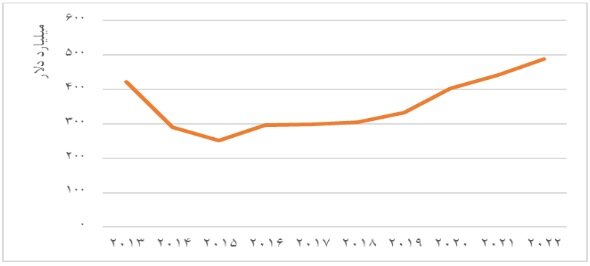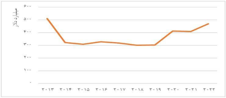 تفاوت میان آمار صادرات و واردات طلا در کشور معنادار به نظر میرسد. همانطور که بیان شد ارزش بالا در واحد حجم، امکان سنجش دقیق تجارت طلا را ناممکن ساخته است. همان طور که در شکل بالا قابل مشاهده است در این بازه 10 ساله بیشترین میزان واردات جهانی در سال 2022 با بیش از 490 میلیارد دلار ثبت شده و کمترین میزان واردات جهانی نیز در سال 2015 با حدود 360 میلیارد دلار گزارش شده است.