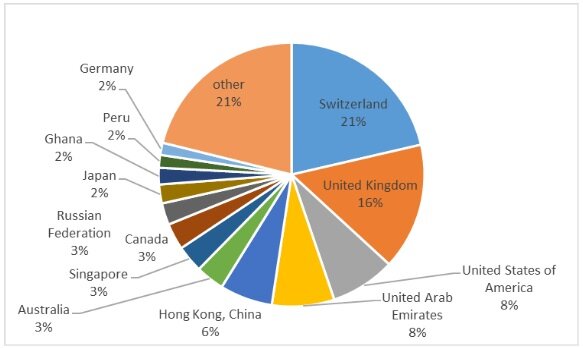 پس از آن انگلستان با 16 درصد و امارات متحده عربی و آمریکا هر کدام با 8 درصد از دیگر صادر کنندگان بزرگ طلا در این سال بودهاند. انگلستان و امارات متحده عربی تولیدکننده معدنی طلا به شمار نمیروند، اما به دلیل آنکه از جمله مراکز سرمایه گذاری جهانی هستند، سهم قابل توجهی از مبادله طلای جهان را در اختیار دارند.