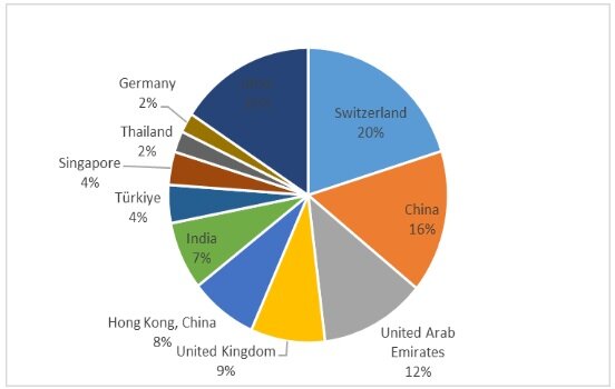 مطابق با شکل زیر، کشورهای چین و امارات متحده عربی برزگ ترین واردکنندگان طلا در قاره آسیا به شمار میروند.