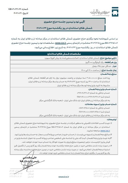 به گزارش نسیم اقتصاد، طبق اعلام مرکز مبادله و بر اساس شیوه نامه نحوه برگزاری حراج حضوری شمش طلای استاندارد در مرکز مبادله ارز و طلای ایران، نود و نهمین جلسه حراج شمش طلای استاندارد در روز یکشنبه مورخ 24 فروردین ماه 1404 برگزار میشود و مهلت واریز وجه الضمان تا ساعت 24 روز شنبه 23 فروردین ماه فراهم است.