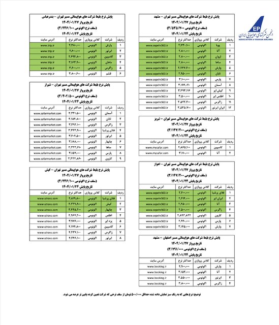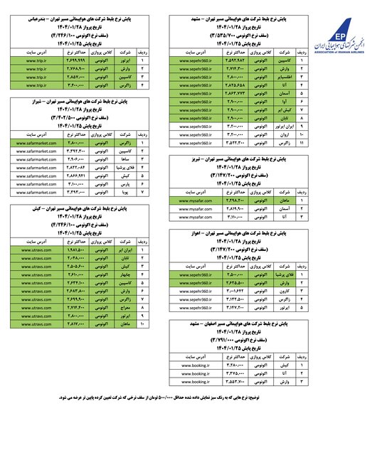 مشاهدات اخیر از بازار بلیت هواپیما نیز نشان میدهد که شرکتهای هواپیمایی سقف نرخ تعیین شده را رعایت میکنند و براساس آخرین پایش انجمن شرکتهای هواپیمایی، نرخ بلیت در روزهای 26، 27 و 28 فروردین ماه در مسیرهای پرتردد به شرح زیر است: