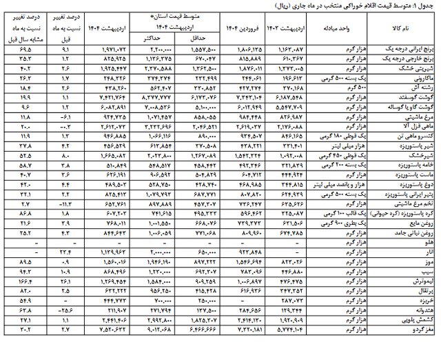 بررسی دادههای مرکز آمار نشان میدهد، خوراکیهای اساسی از قبیل برنج ایرانی(69.5 درصد)، گوشت گوسفند (19.9 درصد) و روغن مایع (86.8 درصد) افزایش قیمت را نسبت به مدت مشابه پارسال تجربه کردهاند. در این میان بیشترین افزایش قیمت را برخی میوهها از قبیل موز، سیب، پرتقال و لیمو ترش داشتهاند و پس از آن کره، برنج و روغن مایع بیشترین افزایش قیمت را داشتهاند. همچنین تخممرغ و مرغ کمترین افزایش قیمت را تجربه کردهاند.