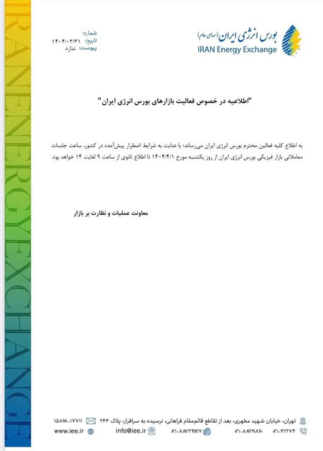به اطلاع کلیه فعالان محترم بورس انرژی می‌رساند، با عنایت به شرایط اضطرار پیش آمده در کشور، ساعت جلسات معاملات بازار فیزیکی بورس انرژی از روز یکشنبه (اول تیرماه 1404) تا اطلاع ثانوی از ساعت 9 الی 14 خواهد بود.