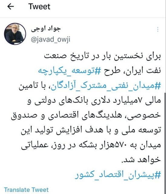 وزیر نفت در تازهترین مطلب خود در توئیتر از عملیاتی شدن توسعه میدان مشترک آزادگان با تأمین مالی 7 میلیارد دلاری خبر داد.