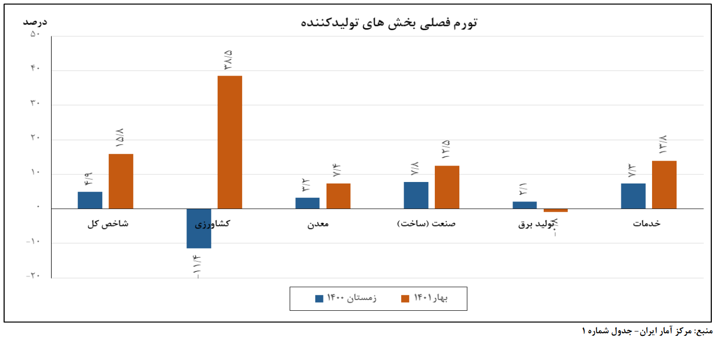در فصل بهار 1401، درصد تغییرات شاخص قیمت کل تولیدکننده نسبت به فصل قبل (تورم فصلی) 15,8 درصد میباشد که در مقایسه با همین اطلاع در فصل قبل (4.9 درصد)، 10.9 واحد درصد افزایش داشته است. به عبارتی، میانگین قیمت دریافتی توسط تولیدکنندگان به ازای تولید محصولاتشان در داخل کشور، در فصل بهار 1401 نسبت به فصل قبل، 15.8 درصد افزایش دارد. در این فصل بیشترین تورم فصلی با 38.5 درصد مربوط به گروه "کشاورزی" و کمترین تورم فصلی با 7.4 درصد مربوط به گروه معدن می باشد. در این فصل گروه "تولید، انتقال و توزیع برق" تورم 0.8- درصدی را تجربه کرده است.
